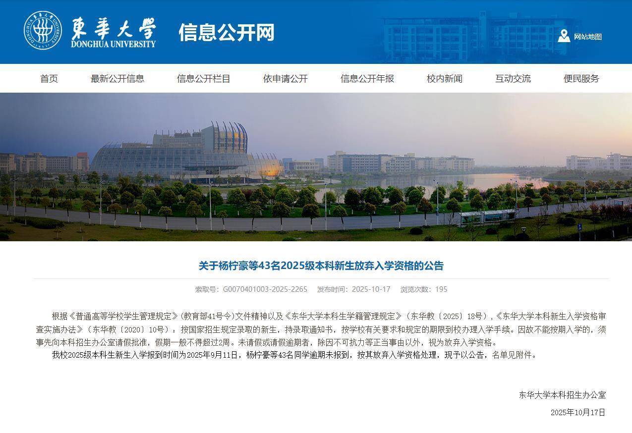 记者在该校官网上查询到,10月17日,该校发布关于43名2025级本科新生放弃入学资格的公告,公告称,根据《普通高等学校学生管理规定》(教育部41号令)文件精神以及《东华大学本科生学籍管理规定》(东华教〔2025〕18号),《东华大学本科新生入学资格审查实施办法》(东华教〔2020〕10号):按国家招生规定录取的新生,持录取通知书,按学校有关要求和规定的期限到校办理入学手续。因故不能按期入学的,须事先向本科招生办公室请假批准,假期一般不得超过2周。未请假或请假逾期者,除因不可抗力等正当事由以外,视为放弃入学资格。我校2025级本科生新生入学报到时间为2025年9月11日,有43名同学逾期未报到,按其放弃入学资格处理,现予以公告。