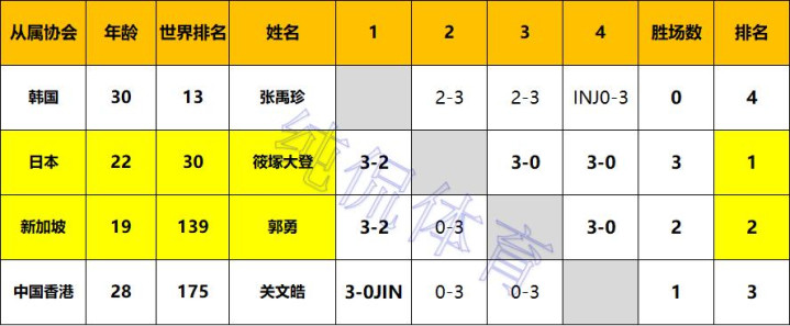 韩国队在本次亚洲杯期间,由于国内有国家队的选拔赛,所以只派出了3位球员出战,男单仅有1人为张禹珍,结果孤军奋战的张禹珍表现不佳,小组赛前两轮全部输球!